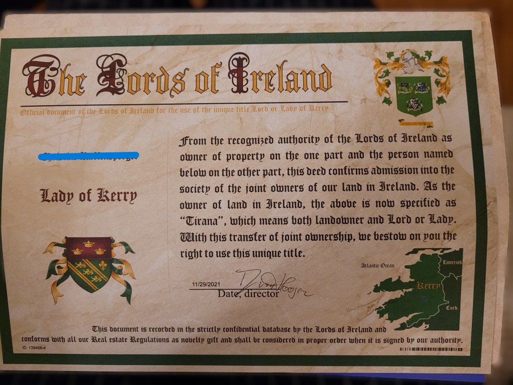 This rather illustrious transformation occurred thanks to my brother, who, in an act of Christmas generosity (and perhaps a touch of mischief), purchased me an “Irish title.” Technically, I am now the Lady of Kerry, complete with a small plot of land, or as the fine print clarifies, a symbolic square foot that could just about accommodate a particularly skinny daisy. I can go visit it, but I can’t redecorate or reside there on a permanent basis.