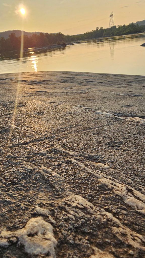 At first, one could easily miss the ancient markings as no more than strange impressions in the rock. It takes a sharp eye to spot them, they are most easily seen at sunrise and sunset when the angle of the light allows them to stand out in sharp contrast. Which is why on a late August evening, my sister and I set out with a small tour group in kayaks to the two islands. I was a little nervous having grown up hearing the dangers of the river especially around the dams which so easily can sweep a person down into their churning depths never to be recovered as their body remains trapped within. However, we were a safe distance from the dam and our guides delayed our departure twice due to unsafe river conditions, so I trusted them to take us out. We donned our life jackets and were given a quick overview of kayaking. My sister and I were the only two non-experienced kayakers as the other members of the tour had brought their own kayaks.