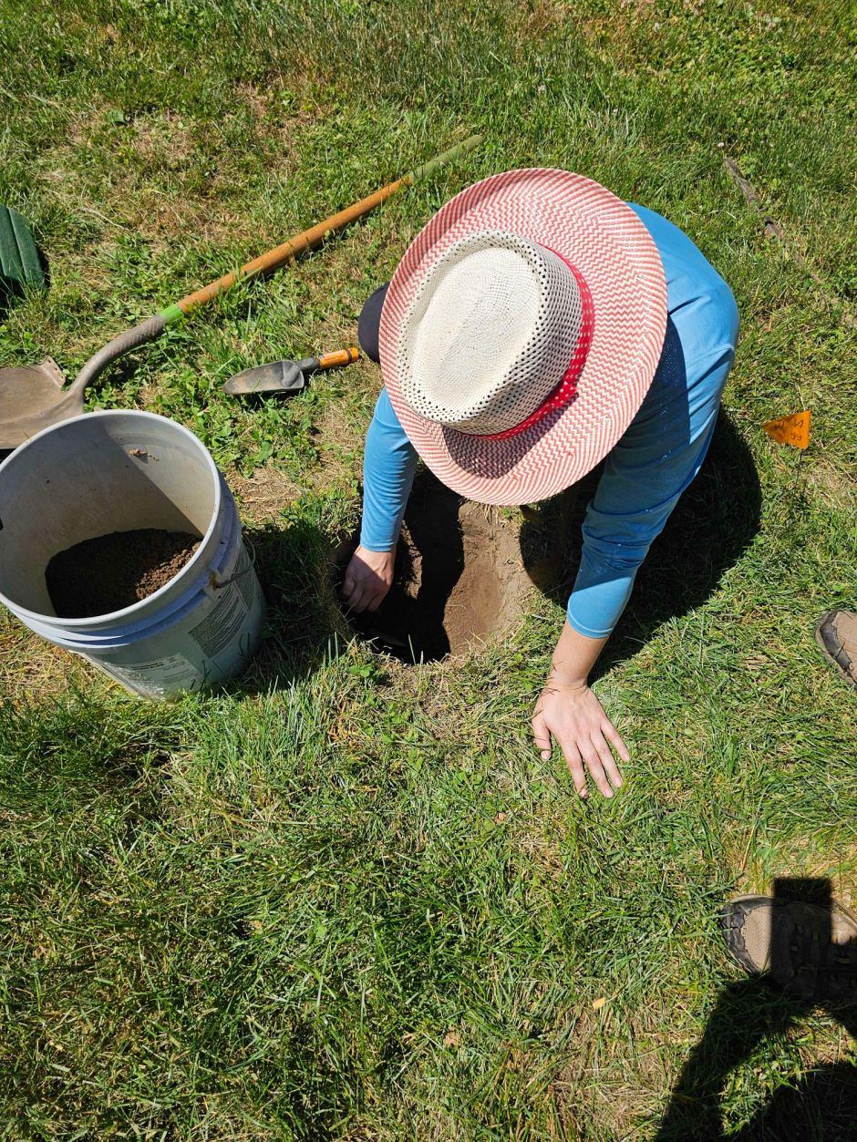 On a warm day in June, I and my sister embarked to discover our own time lost civilization. Using a technique popular among professionals although less glamorous than Hollywood, I assisted in uncovering the boundaries of a people almost forgotten. We drove out to the Blue Rock Heritage Center to meet with Paul Nevin as leading authority on the local pre-columbian peoples of my area. Together we and two other volunteers laid out a grid of 100 feet by 50 feet to conduct a survey. At every intersection of 10 feet, we dug a small circular hole down to the depth of a plow (about 12 inches) to discern where the greatest concentration of artifacts were.